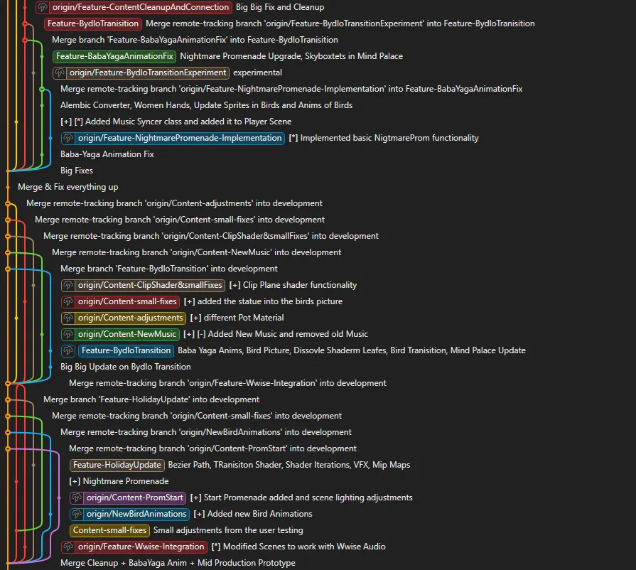 I also managed the project’s version control system, overseeing the creation of the repository and organizing the workflow for team members. Each team member worked off a "development" branch, creating feature or content-specific branches. Once their tasks were complete, these were merged back into the main branch. The branch naming convention (e.g., "Feature--Example" or "Content--Example") kept the repository organized and ensured that merging was efficient and seamless.