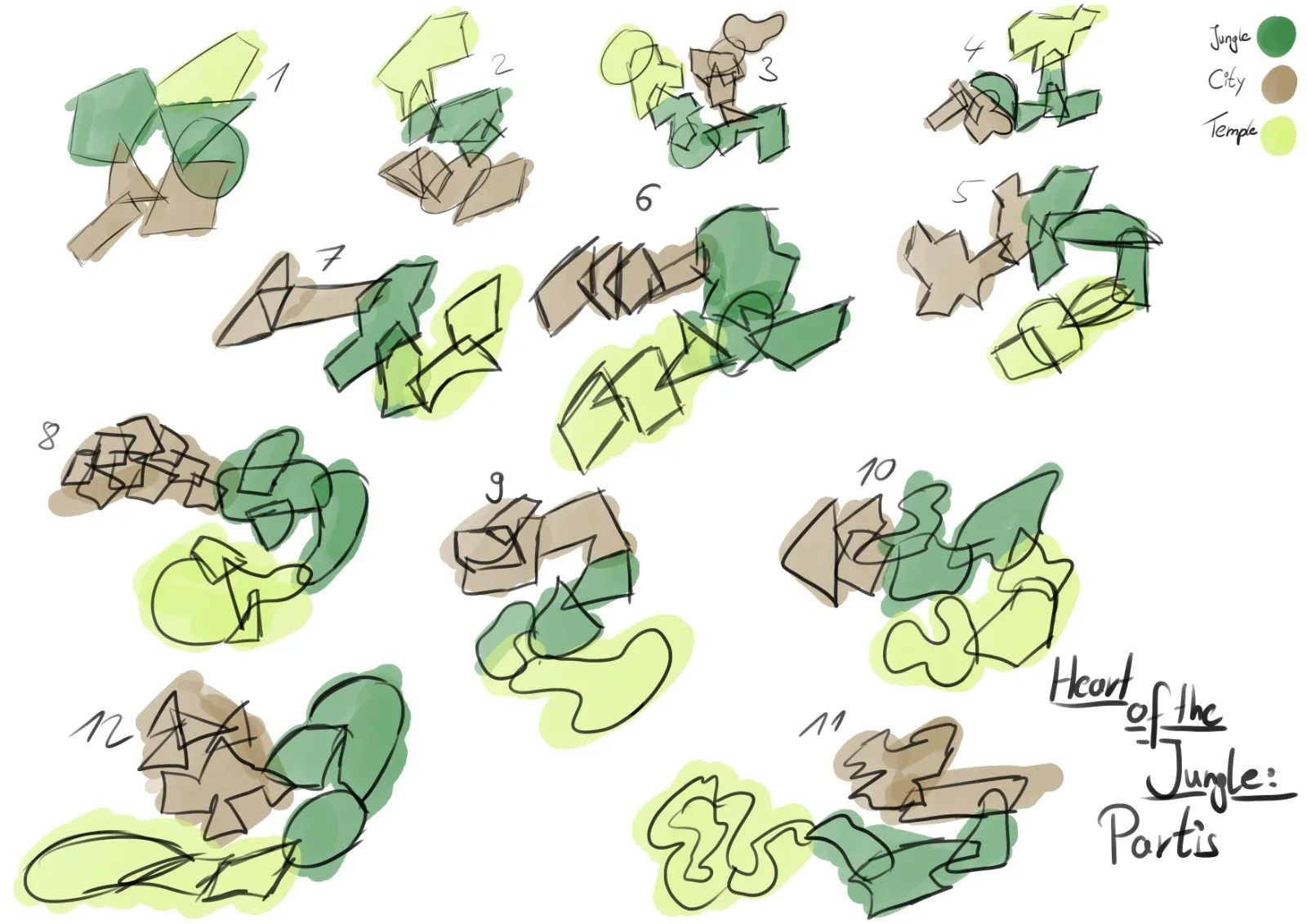 The “S-shape” layout I developed in my ninth flow sketch became my favorite, offering strong line-of-sight control, spatial foreshadowing, and meaningful backtracking possibilities.