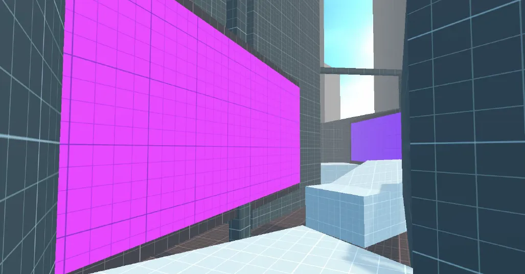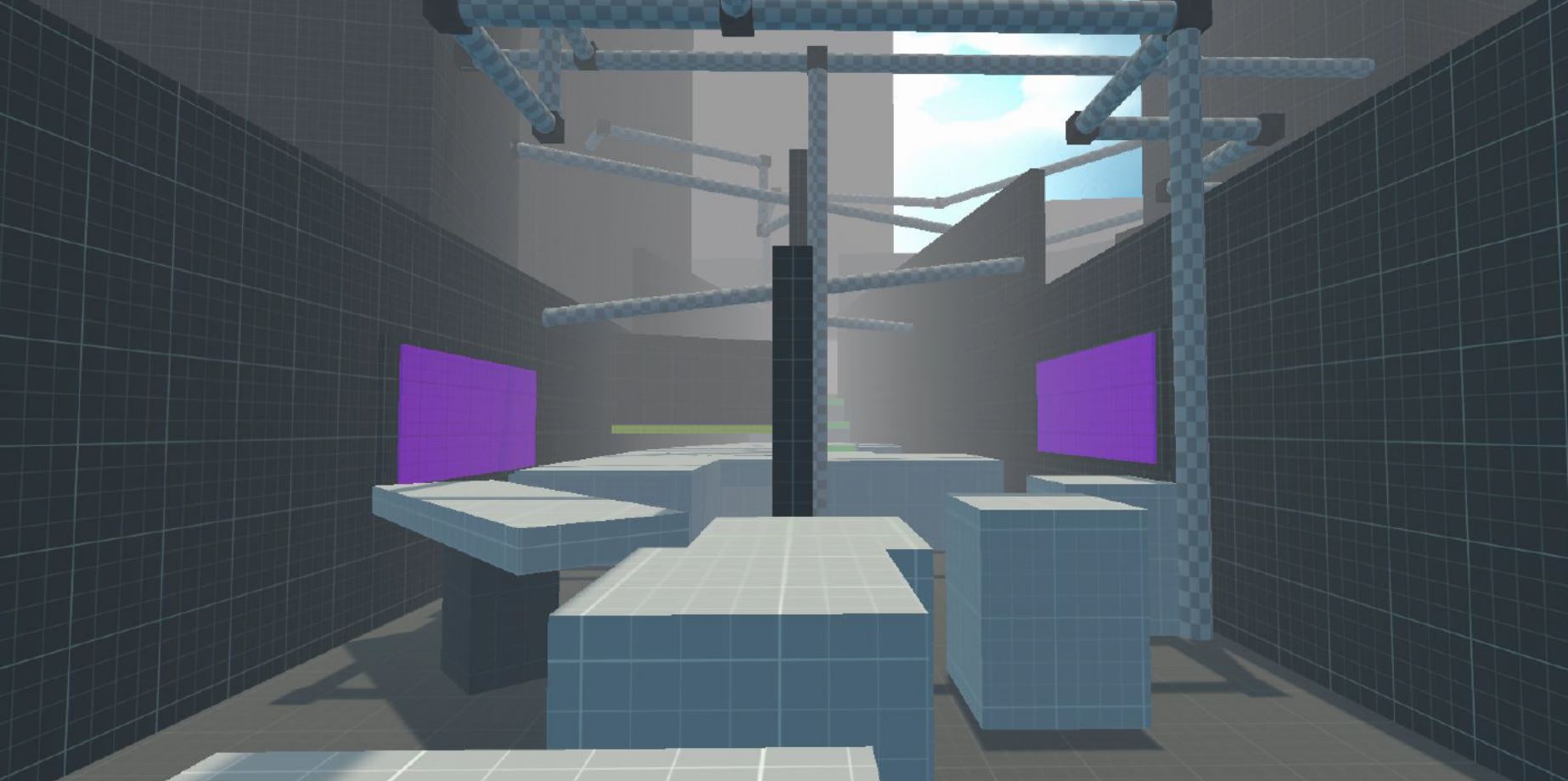 To maintain a tight development focus, a grid-and-checker blockout aesthetic is used throughout the game. This minimal style highlights function over form, allowing development time to prioritize gameplay systems, flow,and level mechanics over visual fidelity.