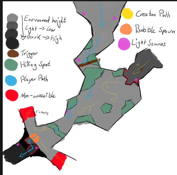 From here,players can choose different paths: one that reintroduces contact with the creature, and another more risky but silent route, introducing a risk/reward design.