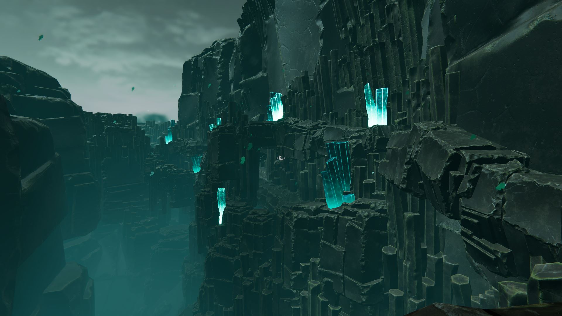 The waterfall section shifts the pacing by removing the creature threat, creating a calm, atmospheric moment focused on movement and environmental interaction. The player faces a massive drop with walls on either side, from which waterfalls cascade into an endless void. To progress, the player must carefully navigate narrow ledges along the walls without falling. This area emphasizes precision movement and introduces a choice between two distinct traversal styles: a high-risk,jump-heavy route, and a safer, crouch-based path that is slower but more secure. This continues the design theme of risk vs. reward and player-paced navigation.