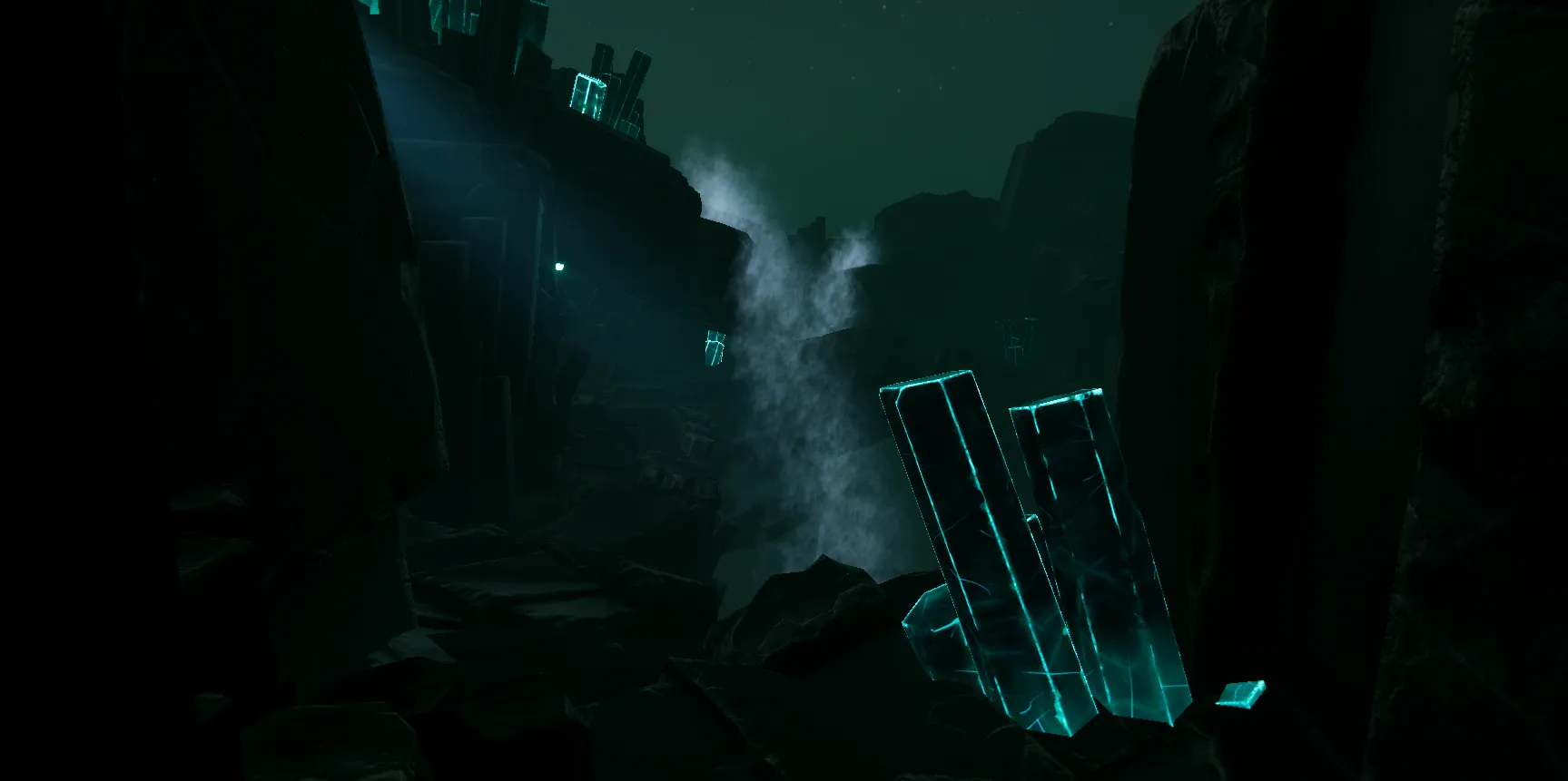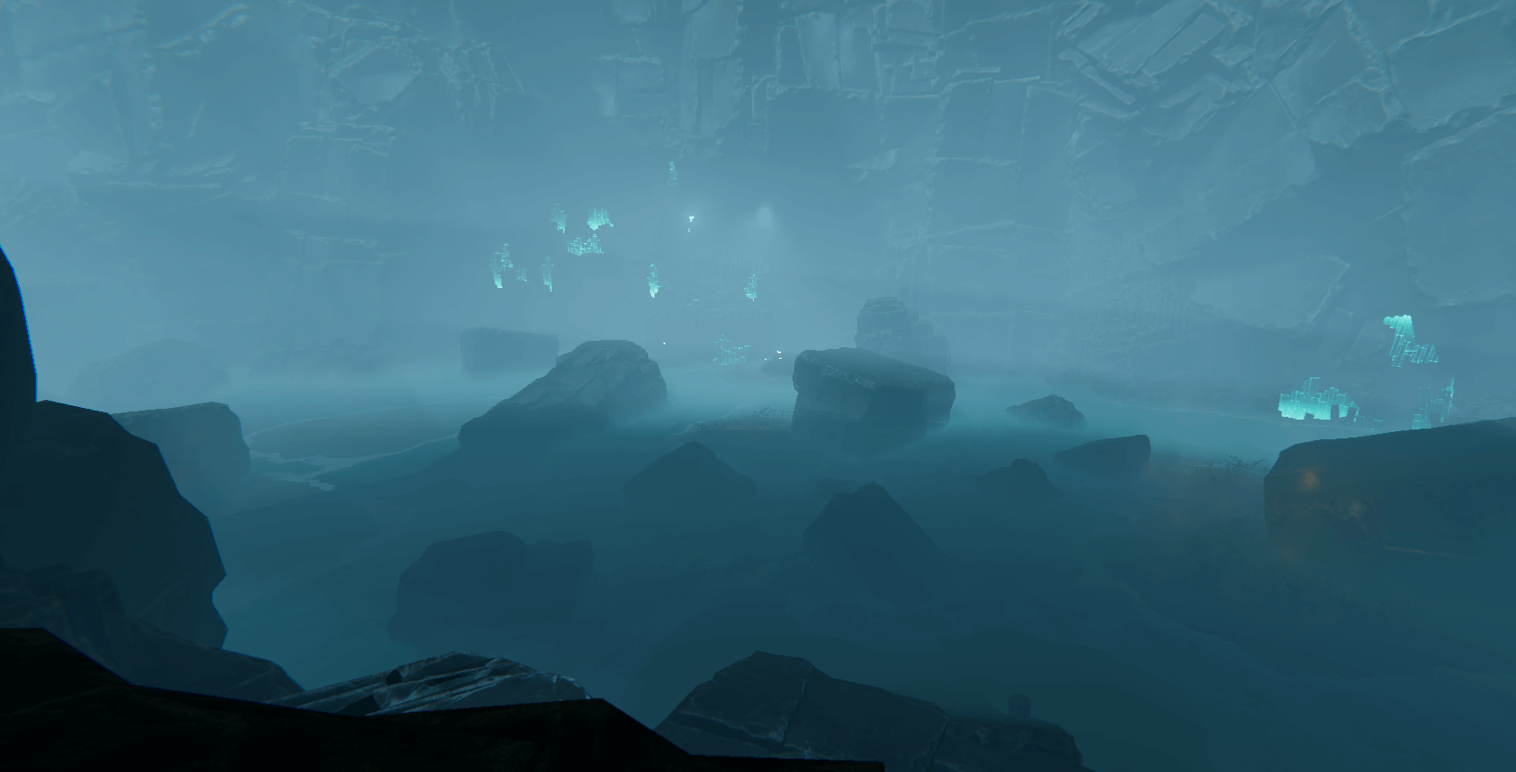 Distraction Mechanics: Players later gain access to throwable crystals, which can be used to distract the creature. These are visually highlighted with outline shaders, ensuring intuitive interaction.