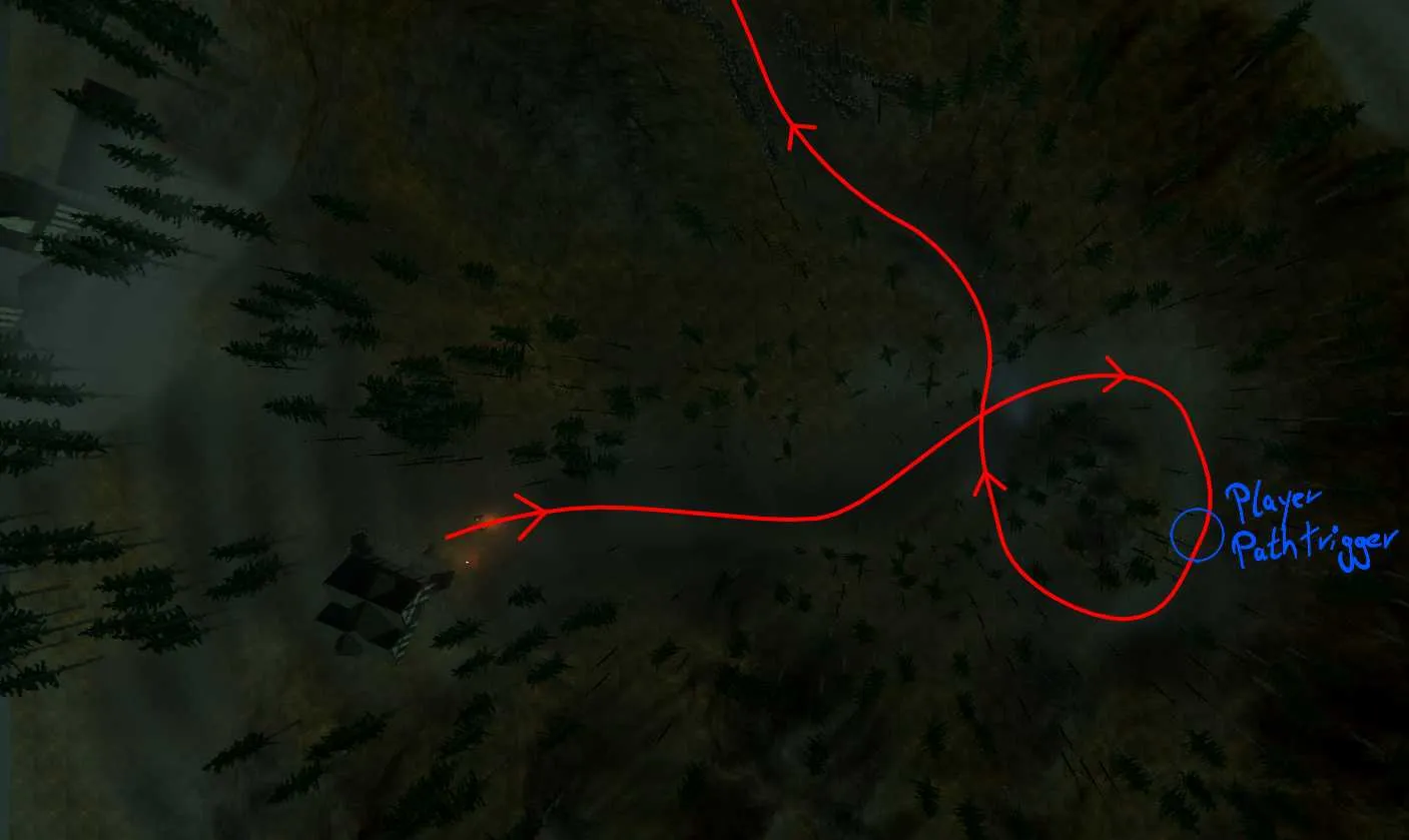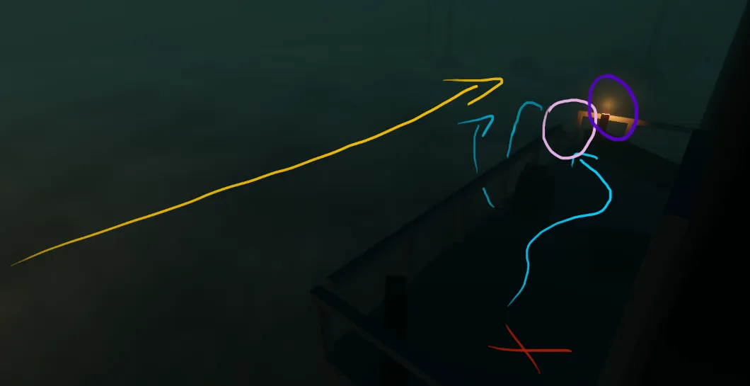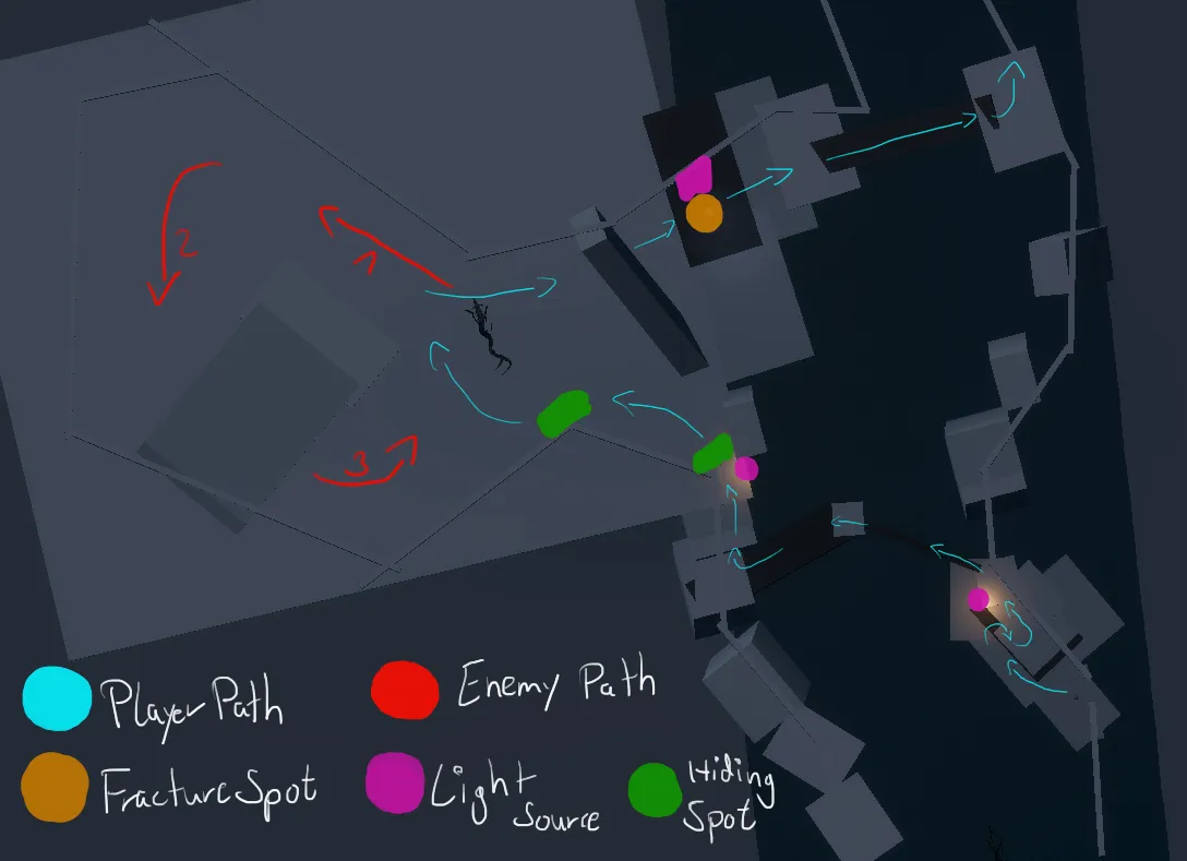This larger hiding spot sets the stage for a scripted creature introduction.Carefully timed, the creature appears only once the player feels safe,creating a powerful contrast between comfort and sudden tension. Entering from the top-left corner, a direction that naturally draws the eye in Western visual culture, the creature follows an S-shaped patrol route: first approaching the player, then retreating, subtly inviting pursuit.