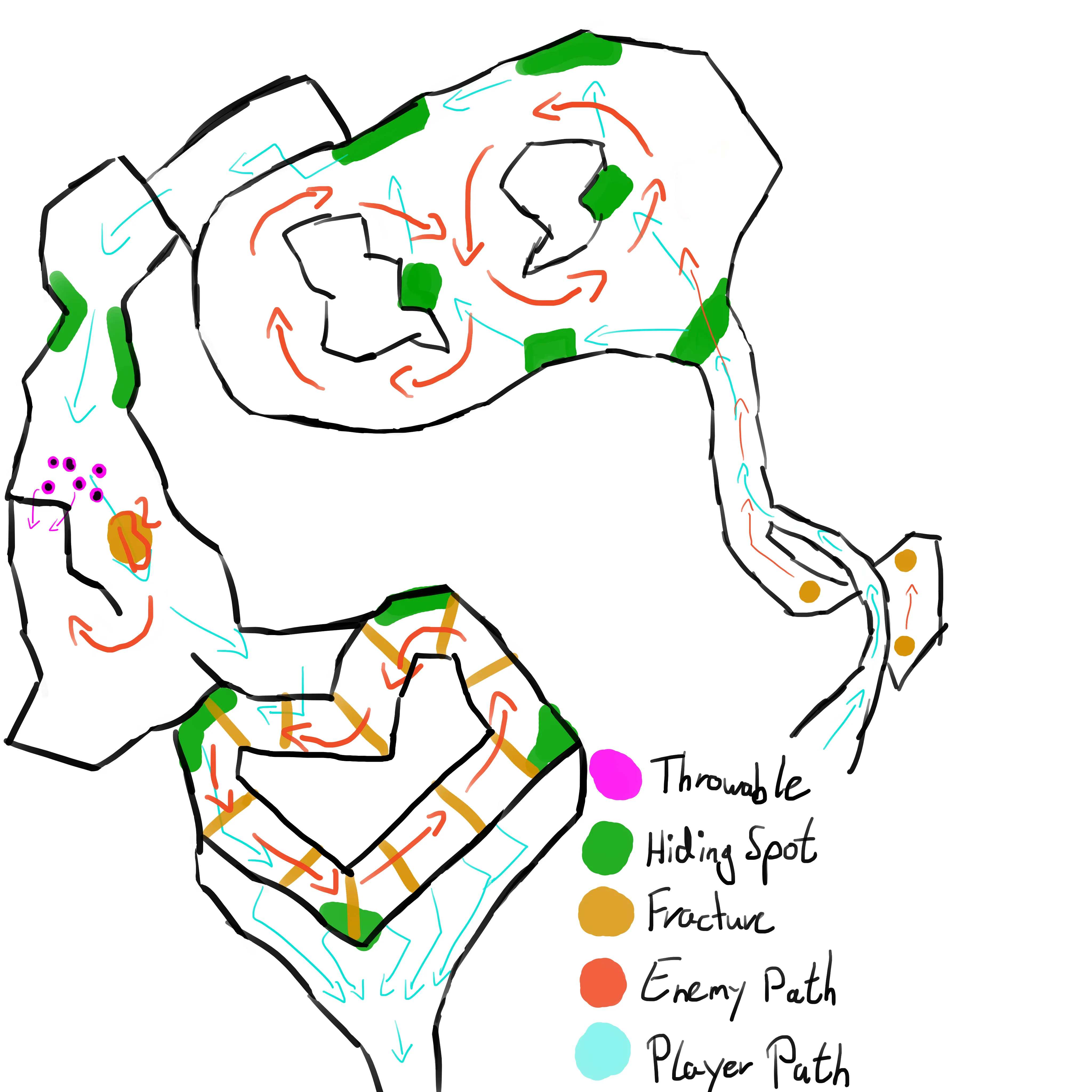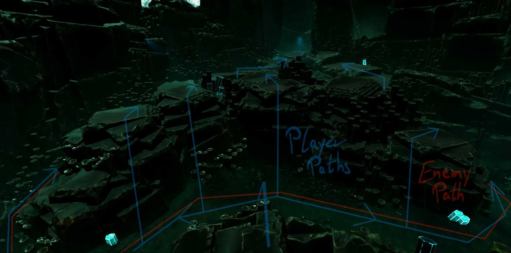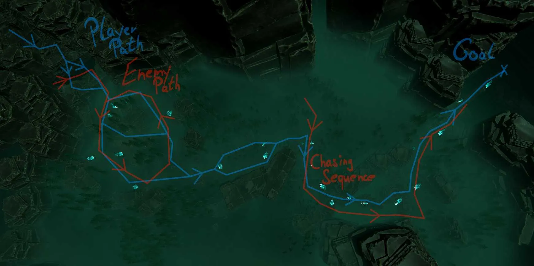 The area begins with a tight, twisting corridor, then expands into a layered river basin, offering both vertical and horizontal navigation. The creature's patrol paths are intentionally varied, creating distinct high-risk zones with faster movement and low-risk zones that offer safer,slower progression. This structure supports player agency, letting them choose between risk/reward tradeoffs. The flow pushes the player naturally from left to right, mirroring earlier directional patterns,while gradually escalating the tactical complexity of stealth and traversal.