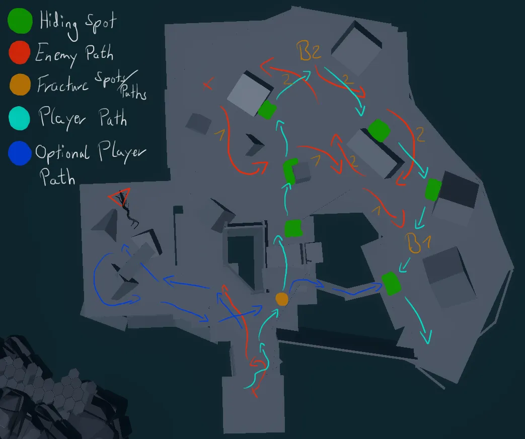 This section is all about heightened anticipation and mechanical mastery.It’s carefully constructed to test the player’s confidence in movement,especially under pressure. The use of curved, narrow geometry subtly increases tension by forcing careful movement while providing clear line of sight to the endpoint. The alternating vertical paths not only add replayability but also train the player's adaptability, preparing them for the unpredictability of the final confrontation. By gradually building difficulty without an immediate enemy threat, the Wall area maintains psychological pressure while allowing space for mechanical refinement.