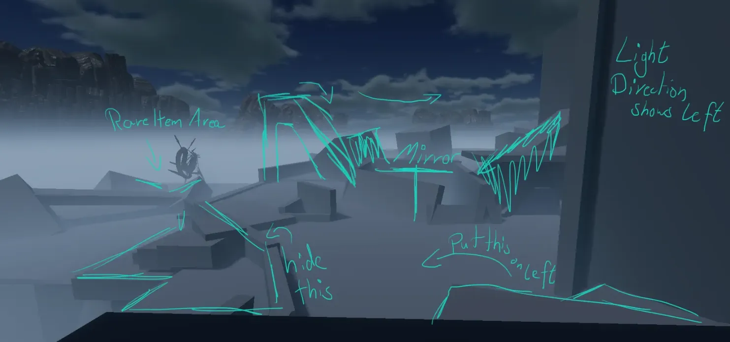 This segment is designed to teach the player to observe, plan, and execute under pressure in a semi-open environment. The player learns to read the creature's patrol logic, identify safe routes, and apply learned mechanics (like distraction and gravity manipulation) in more advanced contexts. The glowing endpoint offers a clear visual goal, keeping players oriented and motivated. The level balances freedom of movement with environmental storytelling, using natural cues like elevation, light, and patrol zones to guide progression without hand-holding.